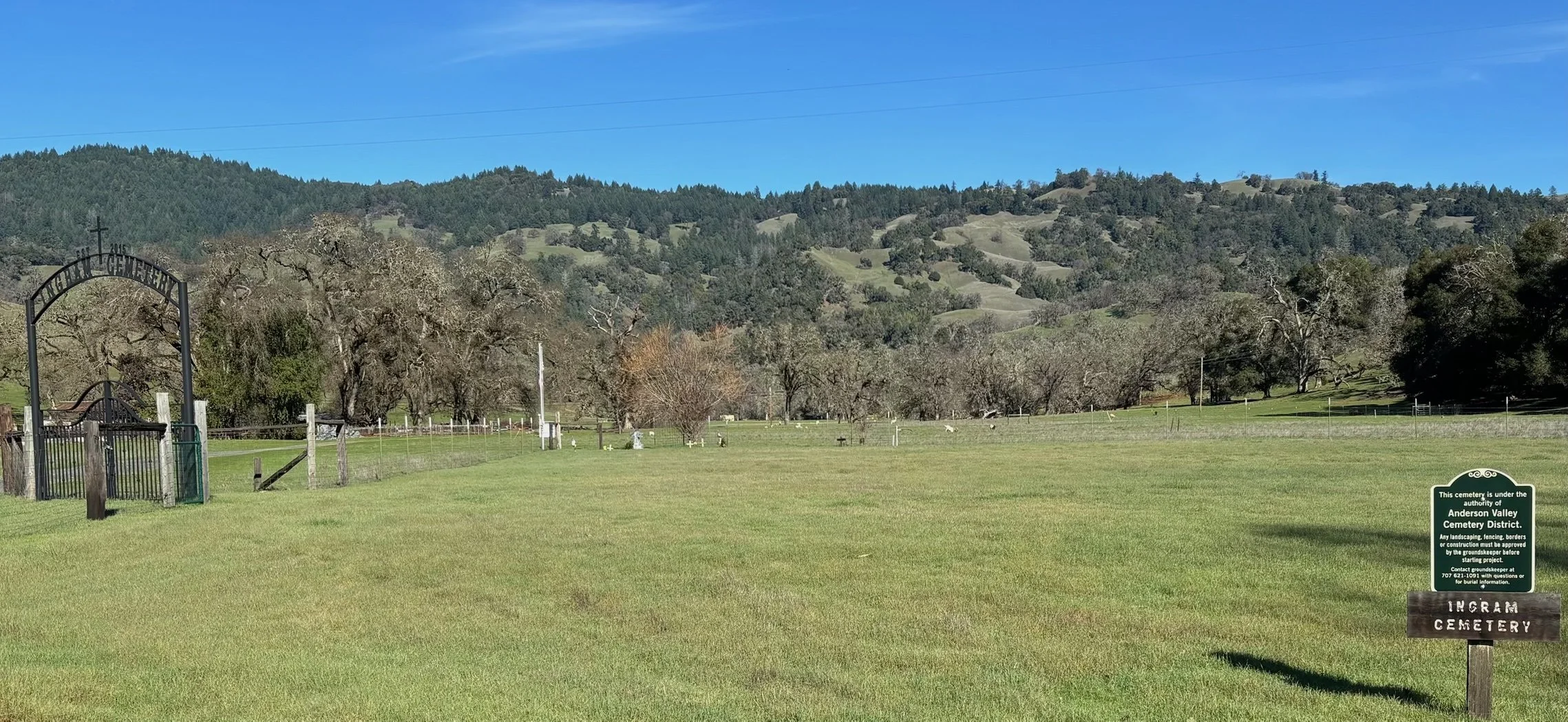 The Anderson Valley Cemetery District was running short of space in their cemeteries and looking for additional property. The Ingram family was seeking a way family members could be interned on their beloved ranch. In 2022, the District purchased two acres of the Ingram ranch and established a new Anderson Valley cemetery. Marie Hill, whose grandparents, Irvin and Ruth Ingram purchased the ranch in 1911, signed the final documents just over a week before she passed. Jim Hill, who still resides on the Ingram Ranch moved his great grandparents, Irvin and Ruth Ingram, his grandparents, his father and sister to the newly established Ingram Cemetery.